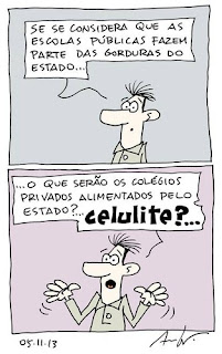 Poderão dizer-me que a minha visão é toldada por ser parcial e não conhecer o reverso da moeda, mimimimi. Só que conheço. Pese embora a minha única experiência com o ensino privado tenha sido na perspectiva de docência, infelizmente pude confirmar que a maior parte das minhas ideias feitas só pecavam pela parcimónia. O ensino privado é, antes de mais, um negócio, e visa principalmente obter o máximo de lucro. Se o ensino é de qualidade, se a oferta lectiva é adequada às necessidades da sociedade e do mercado de emprego, ou se é garantido o bem-estar dos alunos são pormenores - ou pelo menos assim parece! Não querendo extrapolar do particular para o geral, posso dar como termo de comparação os conteúdos programáticos das disciplinas que leccionei e que eram, em dois semestres da universidade privada, inferiores em quantidade e detalhe àquilo que aprendi em apenas um semestre enquanto aluna numa universidade pública. Quanto a condições, eram fracas (equipamento manifestamente insuficiente e horários anti-pedagógicos, por exemplo, até alguns casos extremos de não haver cadeiras suficientes nas salas de aula para todos os alunos), mas nem foi isso que me chocou mais. O que me deixou realmente espantada (e triste) foi o facto dos meus alunos - de cursos com propinas mensais entre os seiscentos e os mais de mil euros - não reivindicarem mais e melhor do que aquilo que lhes era apresentado. Perguntei-lhes porque não reclamavam e as respostas oscilaram entre ombros encolhidos e um tom resignado de "não vale a pena"...